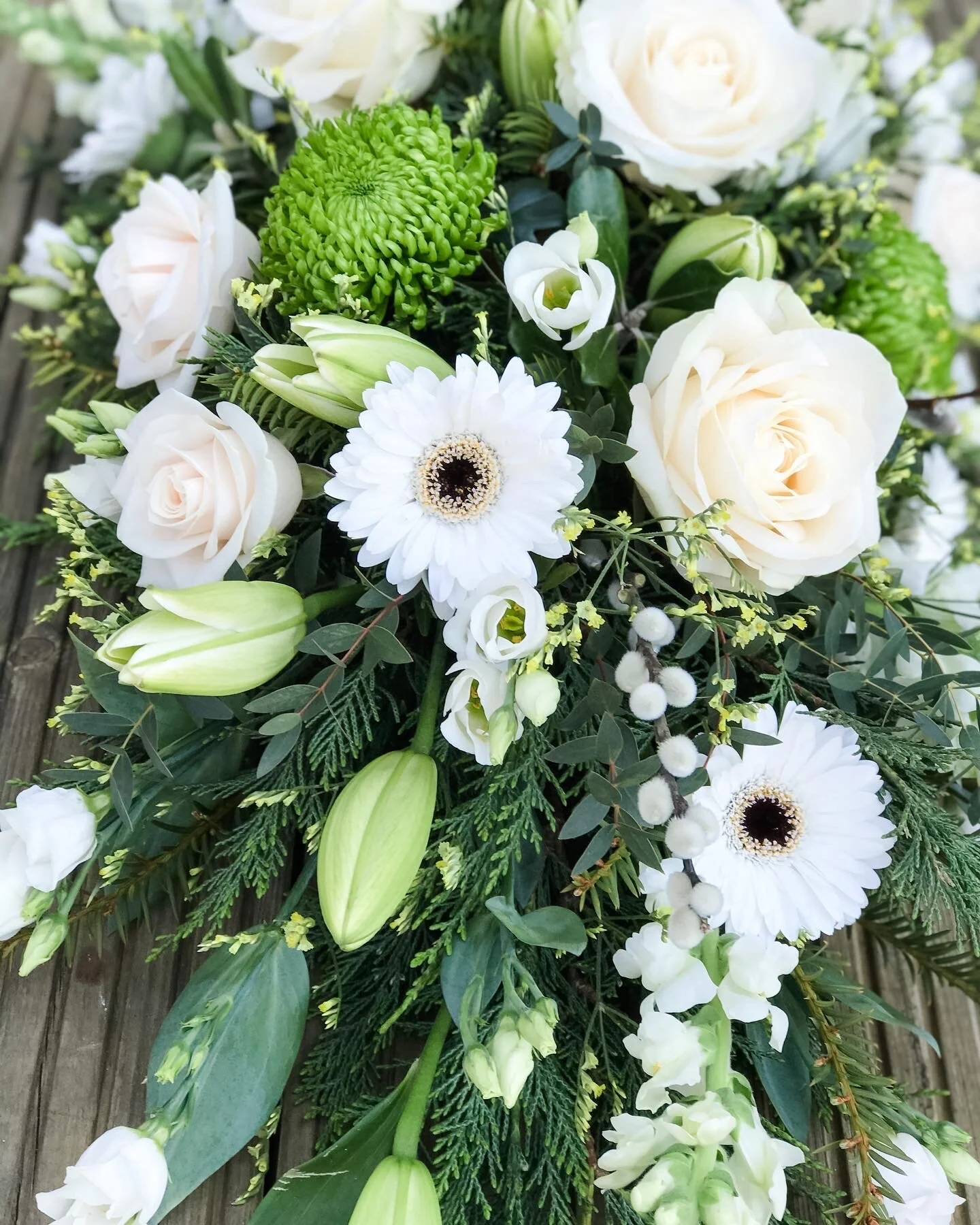 A long spray of beautifully selected flowers that sits on top of the casket. This is a tribute usually ordered by immediate family as a main tribute.